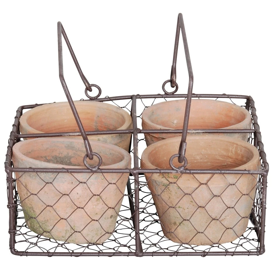 This terracotta pot set comes complete with 4 aged terracotta pots and wire basket. Ideal for creating rustic displays for the conservatory or garden. Pots supplied with drainage holes.